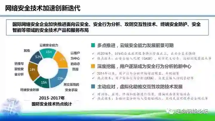 网络安全技术加速创新迭代。国际网络安全企业加快推进面向云安全、安全行为分析、攻防交互性技术、终端安全防护、安全智能等领域的安全技术产品和服务布局。其中,云端安全能力发展前景可期,用户逐渐成为安全行为分析的新中心,虚拟化助推交互性攻防技术发展,设备和智能终端安全防护技术持续升温,安全智能从概念走向落地。