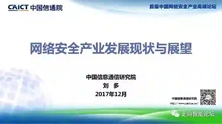 2017年12月12日,由工业和信息化部、北京市人民政府共同指导的首届中国网络安全产业高峰论坛在北京开幕。中国信息通信研究院刘多院长发表了题为《网络安全产业发展现状与展望》的演讲。