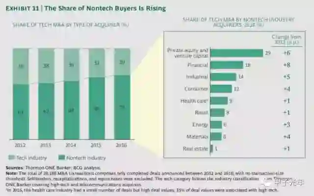 一个显著特点是:促进技术并购案增长的收购主力军是“非技术行业的买家”,比例从2012年的61%上升到2016年的70%。