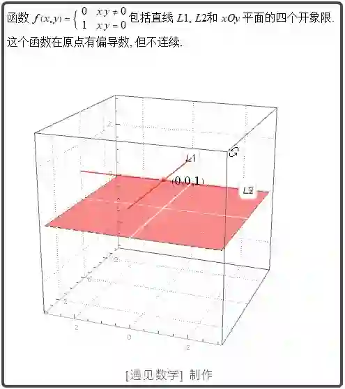 一元函数导数即意味着连续, 但二元函数 f(x,y) 不同, 在一个点不连续, 但对 x 和 y 可以求偏导.