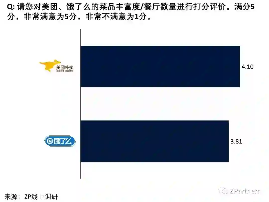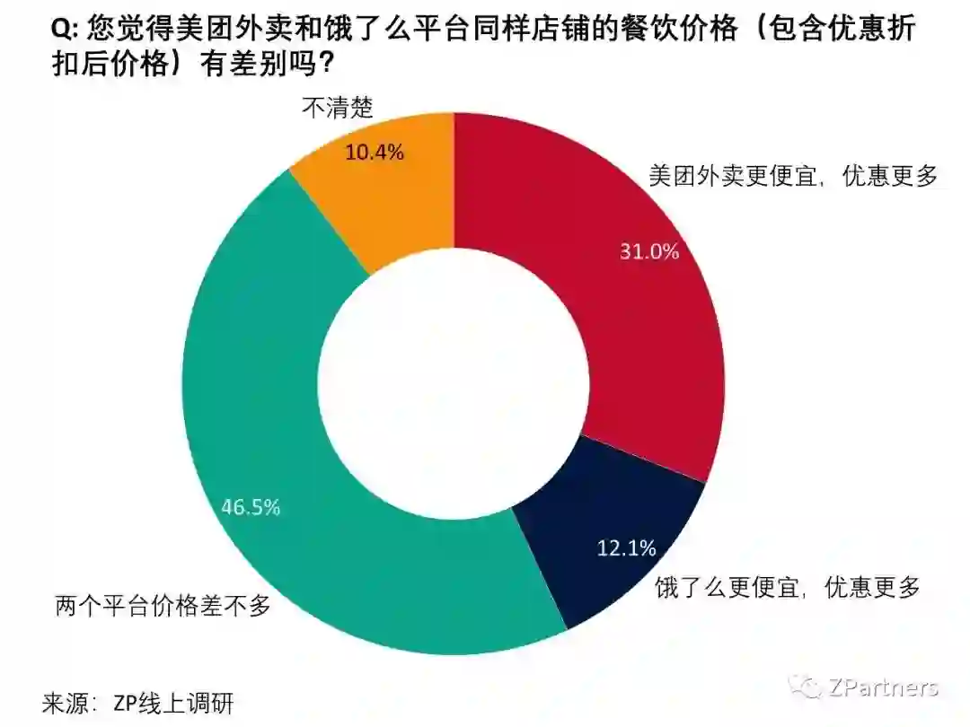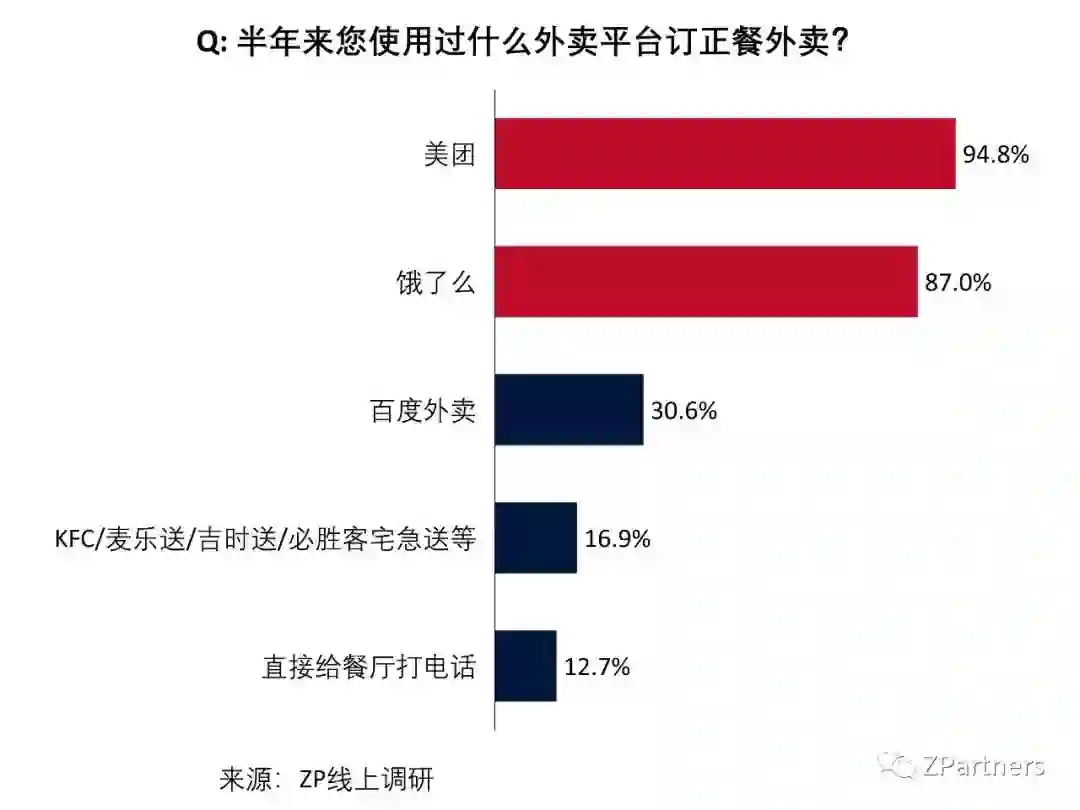 ZP调研发现,美团和饿了么的装机量差距不大。这点在一些第三方数据监测平台也可以得到佐证,接近90%的用户通常会装两个app来点餐。
