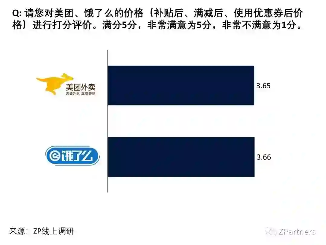 用户调研显示,约一半的用户对谁价格高谁价格低并不清楚;在对价格高低有感觉的用户中,大部分用户认为美团更便宜。在给两者的价格进行满意度打分时,两者的分数也难分伯仲。饿了么要不是就钱还没给够,要不就是白补了。