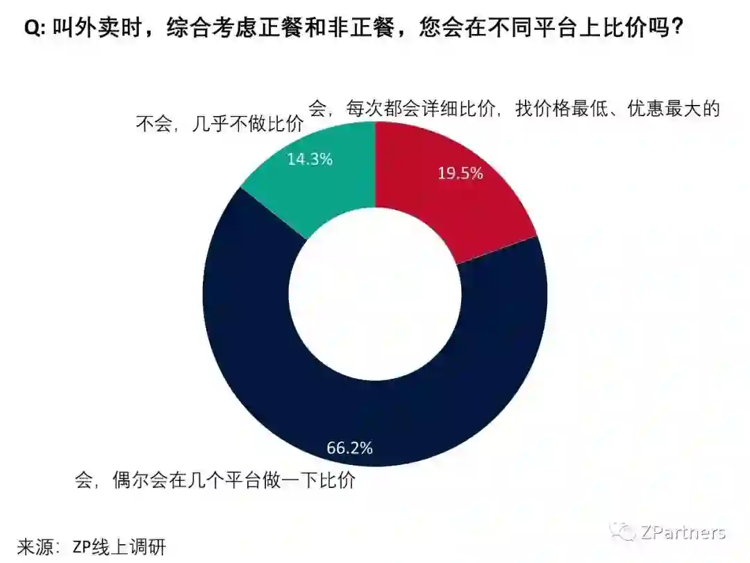 ZP调研发现,在点外卖前,66%的用户仅仅偶尔比价,14%的用户根本不比价;而价格极其敏感的用户仅有19%。访谈中用户表示,“饿的时候哪会想那么多,点一个自己想吃的就行了,不想费时间浪费脑子去比较”。