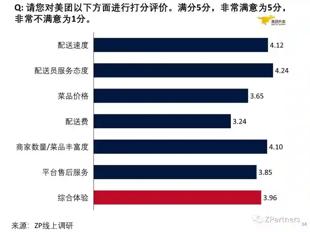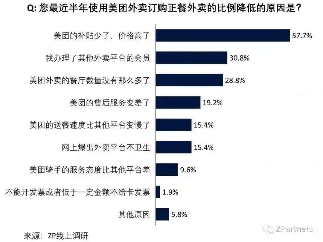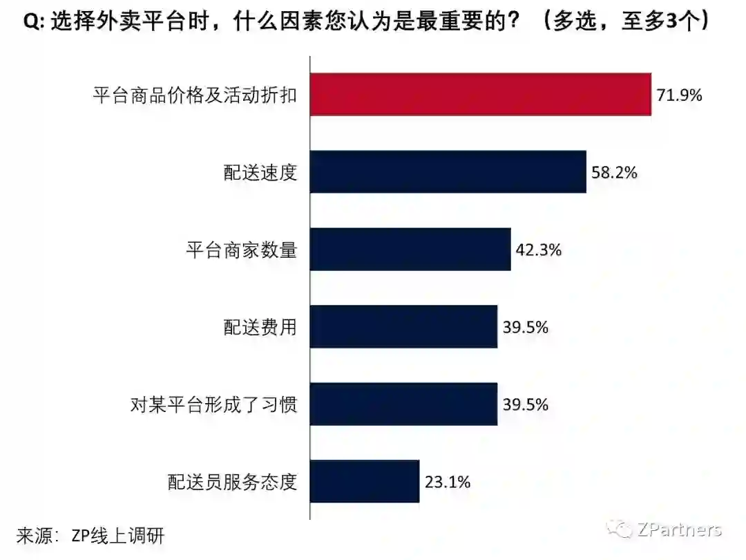 ZP调研发现,用户在选择使用哪个外卖app的时候,最看重的因素依次是:价格>配送速度>商家数量>习惯>其他各个因素。