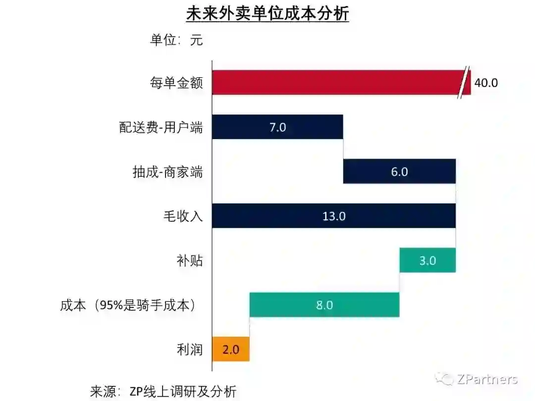 这里和美团公布的统计口径不同,ZP都采用了自己的调研结果:用户每单平均30元的花费(只考虑给自己点单一个人吃),3.5元的配送费(三线城市会很低),商家一单被抽成10%,即3元抽佣——外卖平台一单收入6.5元。