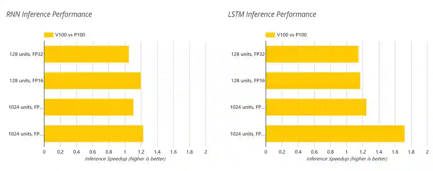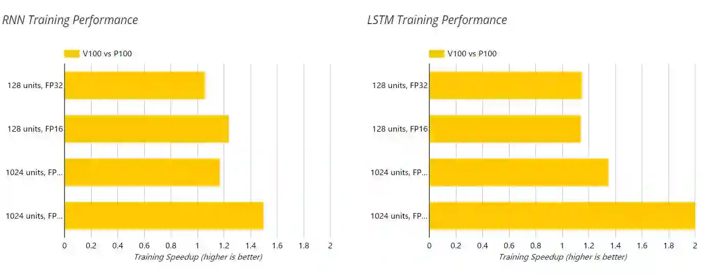 虽然 V100 与 P100 相比显示出强大的硬件性能提升,但深度学习中擅于处理时序数据的循环神经网络无法充分利用 V100 这种专门化地硬件加速,因此它只能获得有限的性能提升。