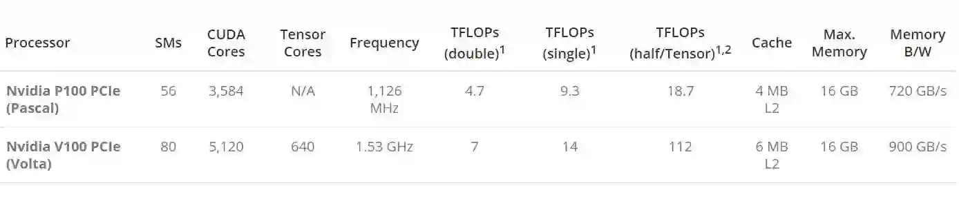下表展示了英伟达 P100 和 V100 GPU 的关键性能与不同点。
