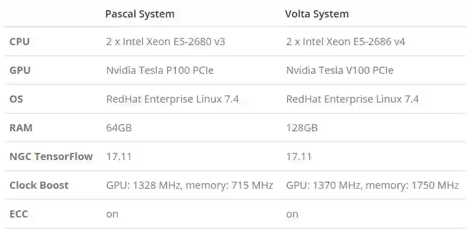 我们比较了模型在 Pascal 和 VoltaGPU 上的性能,且系统所使用的配置如下所示: