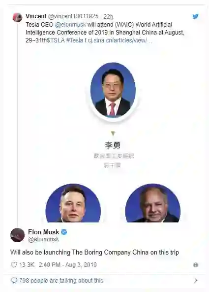 马斯克将于8月29日至31日在上海举行的世界人工智能会议上发表演讲。演讲中将回应关于他关于此事的推文:“此次旅行还将推出The Boring Company China。”