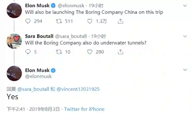 另一位Twitter用户回复,询问马斯克是否也会涉及水下隧道业务 - 马斯克回答说“是的”。