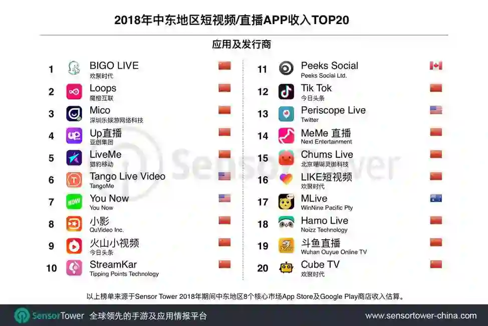 在 Sensor Tower 发布的“2018 年中东地区短视频/直播应用TOP20 榜单”中,Vigo位列下载榜第 5 名、收入榜第 9 名。无论是从用户量还是收入来看,Vigo 似乎都表现不俗。
