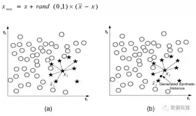 SMOTE算法是用的非常广泛的数据生成策略,流程可以参考上图,还是非常简单的,下面我们使用现成的库来帮助我们完成过采样数据生成策略。