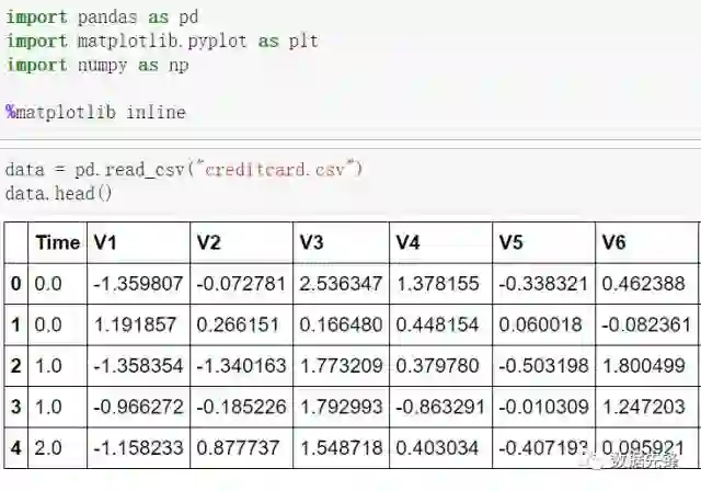 首先我们用pandas将数据读进来并显示最开始的5行,看见木有!用pandas读取数据就是这么简单!这里的数据为了考虑用户隐私等,已经通过PCA处理过了,现在大家只需要把数据当成是处理好的特征就好啦!(数据和代码下载见文末)