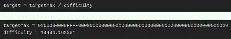 区块链协议规定,使用一个常量除以难度系数,可以得到目标值(target)。显然,难度系数越大,目标值就越小。