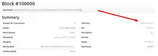原来,区块头包含一个难度系数(difficulty),这个值决定了计算 Hash 的难度。举例来说,第100000个区块的难度系数是 14484.16236122。