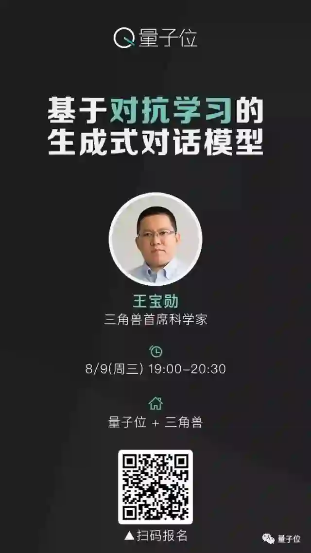 8月9日(周三)晚,量子位邀请三角兽首席科学家王宝勋,分享基于对抗学习的生成式对话模型,欢迎扫码报名 ▼
