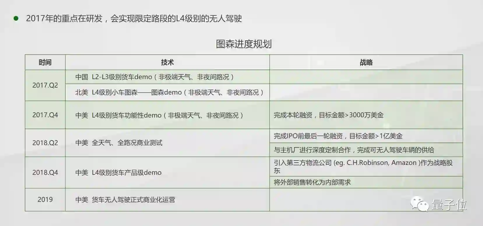 下图展示了图森未来的进度规划:2019年实现无人车商业化运营。