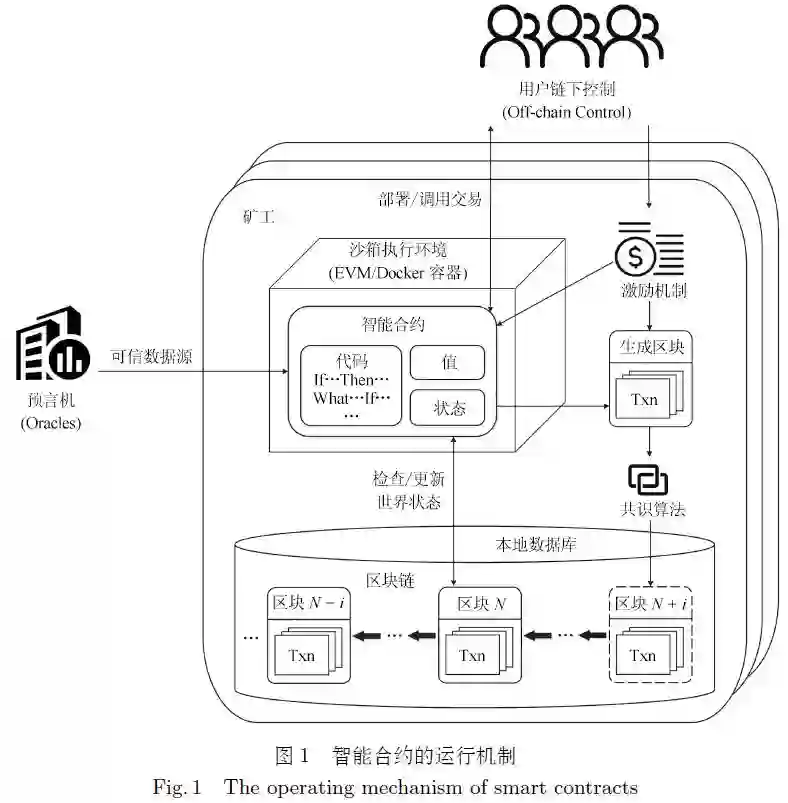 智能合约的运行机制如图1所示, 智能合约一般具有值和状态两个属性, 代码中用If-Then和What-If语句预置了合约条款的相应触发场景和响应规则, 智能合约经多方共同协定、各自签署后随用户发起的交易(Transaction, Txn)提交, 经P2P网络传播、矿工验证后存储在区块链特定区块中, 用户得到返回的合约地址及合约接口等信息后即可通过发起交易来调用合约.矿工受系统预设的激励机制激励, 将贡献自身算力来验证交易, 矿工收到合约创建或调用交易后在本地沙箱执行环境(如以太坊虚拟机)中创建合约或执行合约代码, 合约代码根据可信外部数据源(也称为预言机, Oracles)和世界状态的检查信息自动判断当前所处场景是否满足合约触发条件以严格执行响应规则并更新世界状态.交易验证有效后被打包进新的数据区块, 新区块经共识算法认证后链接到区块链主链, 所有更新生效.
