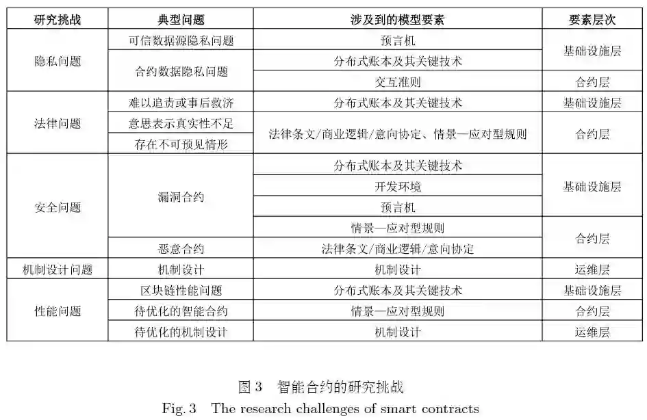 为使行文清晰, 图3总结了第2.1~2.4节中所述智能合约研究挑战、典型问题、涉及到的模型要素和要素层次等.