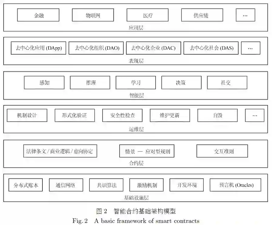 智能合约的生命周期根据其运行机制可概括为协商、开发、部署、运维、学习和自毁六个阶段, 其中开发阶段包括合约上链前的合约测试, 学习阶段包括智能合约的运行反馈与合约更新等. 图2所示为智能合约的基础架构模型, 模型自底向上由基础设施层、合约层、运维层、智能层、表现层和应用层组成, 以下将分层进行阐述.