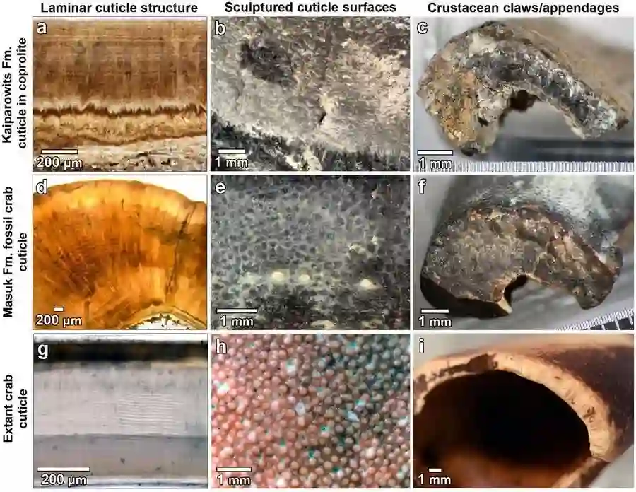 凯佩罗维兹组甲壳纲动物、Masuk组螃蟹化石和现存螃蟹标本的角质层特征对比。