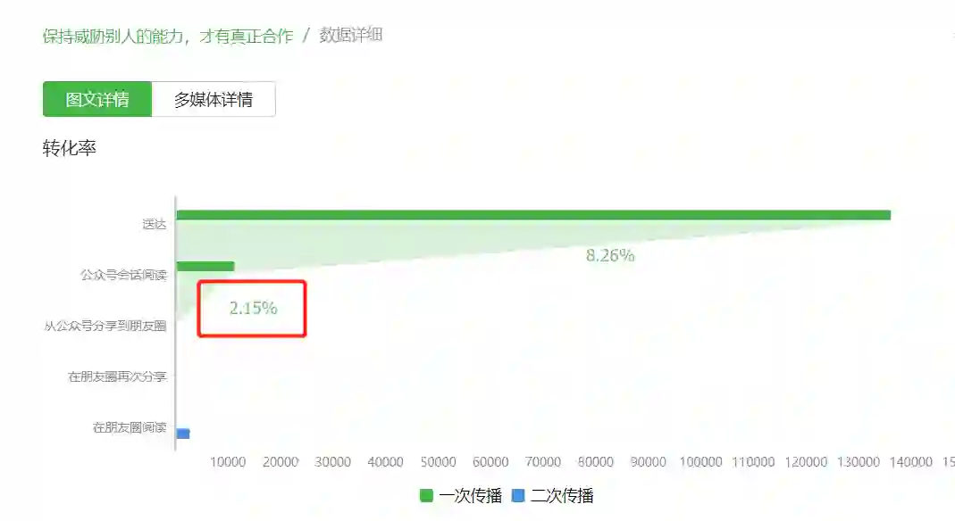 衡量这个动作的指标,是微信提供的“号内转发率”,也就是“从公众号转发到朋友圈的人数”占“打开公众号的人数”的比例。