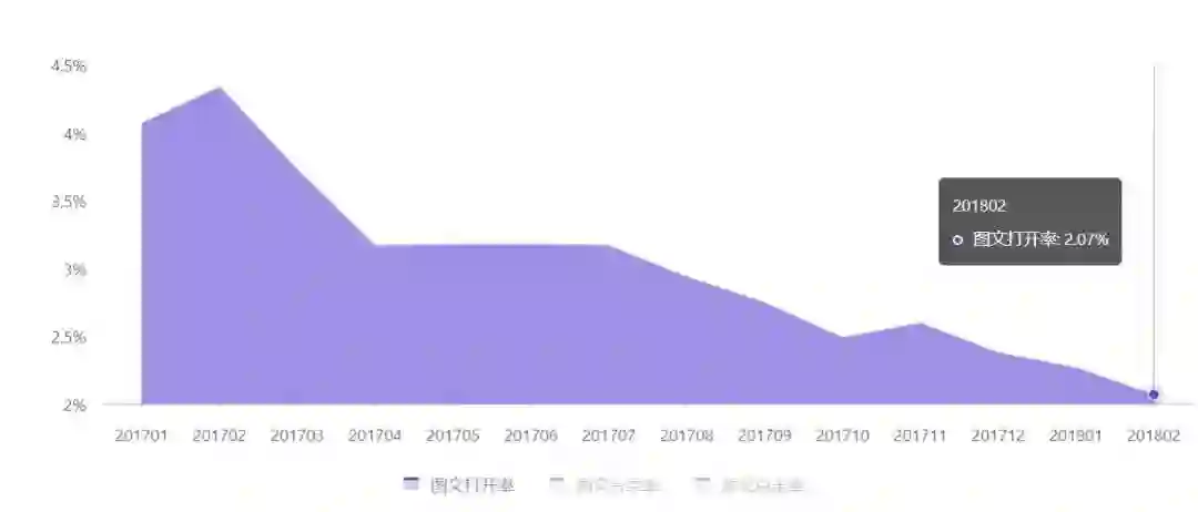 这张图是整个微信公众号平均打开率,本来就很低,只有4-5%,从2017年年初到现在,几乎下跌了50%。