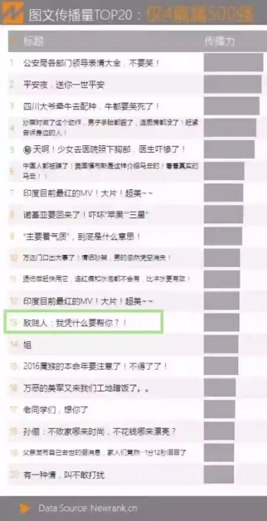 这是2015年12月新榜统计的传播力最强的文章,仅4篇是从500强的大号出来的,可见朋友圈需要的是“接地气”。
