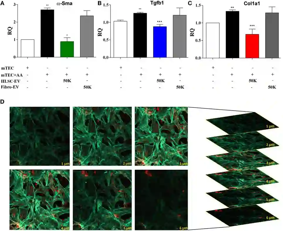 图: 人肝干细胞衍生的细胞外囊泡(HLSC-EVs)在马兜铃酸肾病的体外模型中下调促纤维化基因.