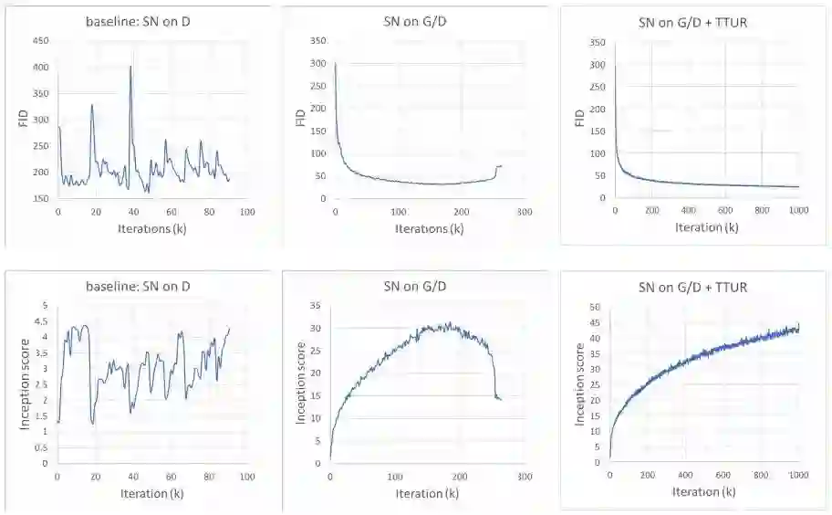 在进行实验前,作者使用了两种方法来稳定模型训练:首先,对生成器和判别器同时做谱归一化;其次,在生成器和判别器中使用不同的学习率(TTUR)。他们发现这样做可以解决判别器正则化过程中学习速度过慢的问题。