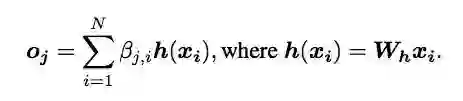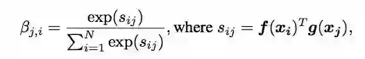 βj,i,是f(x)⊗g(x)经softmax后的结果,表示模型合成j区域图像内容时i区域的参与程度,即相关性;