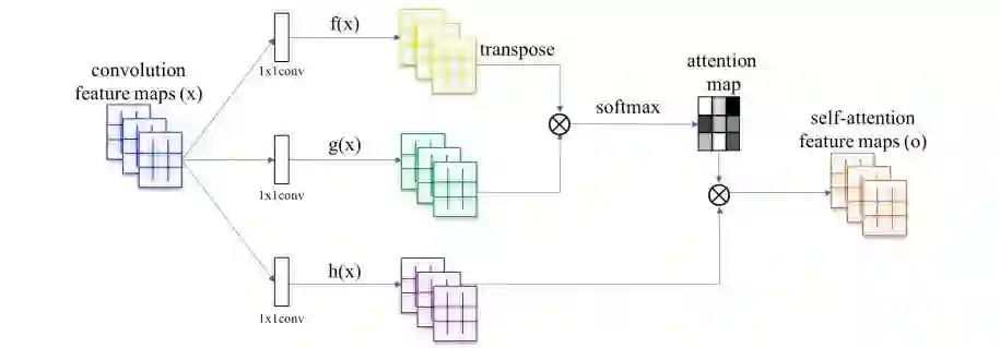 SAGAN中的自我注意力模块:⊗表示矩阵乘法,每一行都用Softmax归一化