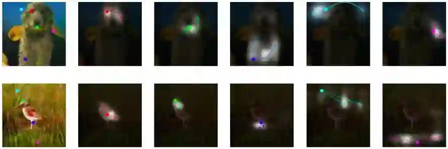 如上图所示,SAGAN不是通过固定形状的局部区域来生成图像,而是利用图像较远部分的互补特征生成一致的对象/场景。每一行第一副图上的彩色点表示查询位置,之后几幅图是其相对应的注意力图(attention map),图中箭头表示“最受关注”的区域。