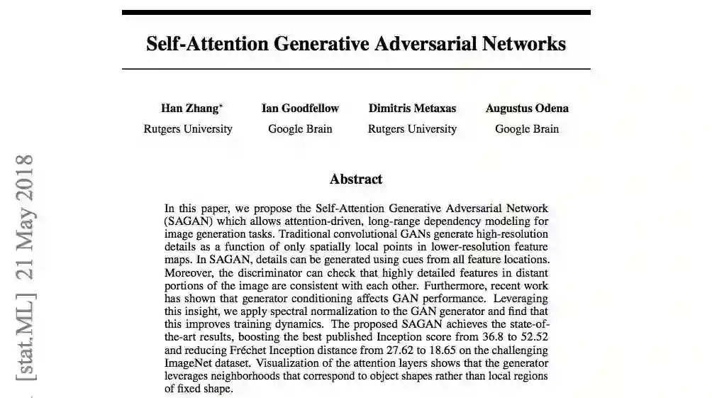 编者按:近年来GAN的发展如火如荼,相关成果也不断涌现。但随着它在图像生成领域的深入实践,研究人员也发现GAN在生成多类图像上始终存在局限。其中的一个关键是它只能从低分辨率特征中提取信息,缺乏对高分辨率特征的理解和对各类特征的长期记忆。近日,罗杰斯大学和Google Brain的研究人员合作发表了一篇论文,大胆把NLP中的self-attention模型引入GAN,解决了特征记忆问题,把图像生成的基础分从36.8一下提到了52.52。
