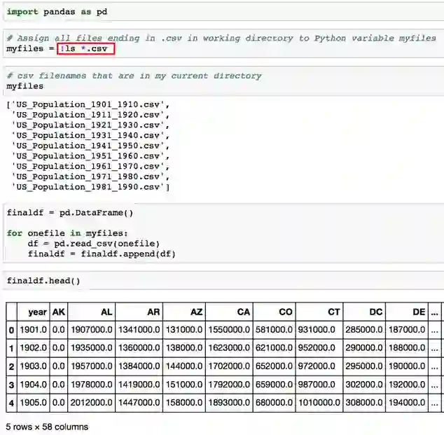 下面这张图里的Python代码能够将多个数据集合并到一起。注意在这个Jupyter文档中红框里的部分,它就是一个Unix Shell命令。