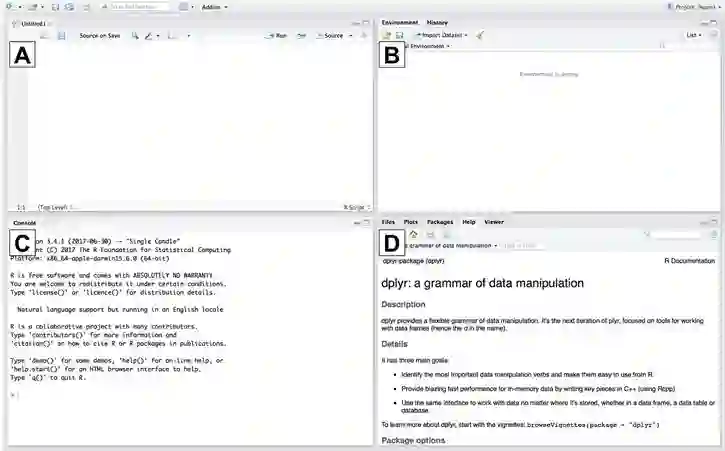 打开RStudio时,屏幕如上图所示。四个窗格分别是:(a)一个文本编辑器。(b)一个开发环境的控制面板。(c)R解释器。(d)帮助窗口和包管理系统。这些特性使得它能够成为在你安装R语言之后真正需要的RStudio。新手们经常问的一个问题是如何在R中安装软件包。下面的视频演示了使用RStudio的包管理器安装tidyverse的一个方法。