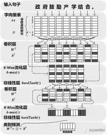 网络首先将输入句子中每个字符通过查找字向量表的方式转成相应的向量表示。每一个字符的表示可以随机生成或者采用无监督的方法进行预训练。句子经转换之后形成一个特征矩阵。第二步:在特征矩阵的每一维度上,根据设定的窗口大小,采用卷积的方法将窗口特征输入转换成新的特征。窗口在特征矩阵上从左至右依次滑动,产生与特征矩阵列数相同的更高一层的特征表示。不同维度采用不同的卷积核,从而产生输入特征矩阵的一个特征地图。可以同时使用一组不同的卷积核来产生多个特征地图。每一个特征地图上采用 k-max 池化的方法采出 k 个最为显著的特征,即在每一维度上提取 k 个最大的特征值,但这些特征值的顺序保持其在输入特征地图中的顺序。在 k-max 池化后的结果矩阵上使用 hardTanh 非线性函数进行特征转换。上述第二步可以叠加多层,新的一层在上一层的结果上进行操作。最后一层的 k-max 池化的 k 值固定(模型的超参数),之前每一层的k值取根据输入句子长度动态产生。第三步将最后一层获得的所有特征值进行拼接,来产生全句的语义表示。在语义表示的基础上,通过一个线性层和 Softmax 层来对句子所属类别进行预测。