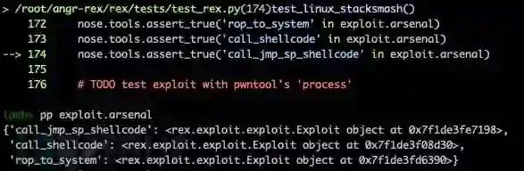 Rex的实现基于Angr,主要采用混合符号执行技术,对原理感兴趣的同学可以阅读论文《(State of) The Art of War: Offensive Techniques in Binary Analysis》。由于封装的原因,整体代码看起来较为简洁,从漏洞复现、漏洞类型判定、Exploit生成到Exploit有效性验证,共计10行代码。其中,Crash类用以复现漏洞并返回漏洞类型,Exploit类用以判定漏洞的可利用性,并生成Exploit。171 ~ 174行用以验证Exploit的有效性。