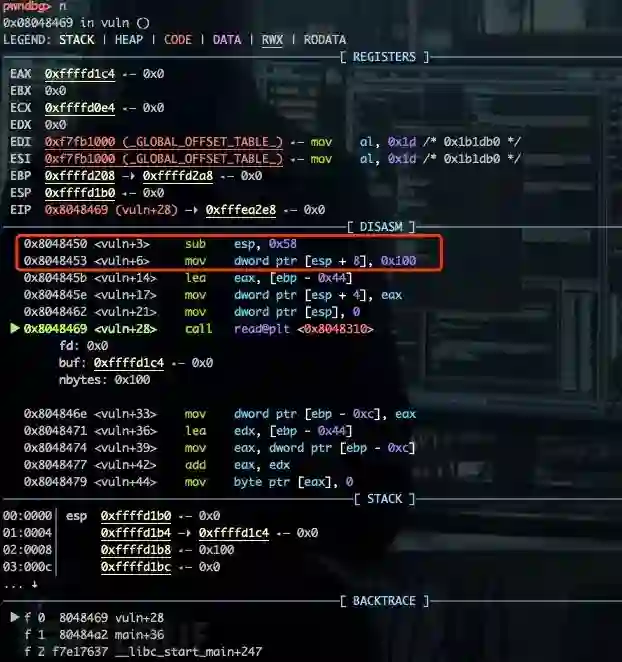使用radare2简要分析vuln_stacksmash。vuln()函数中,调用 read(int fd,void * bu,size_t count)时未检查缓冲区大小,导致栈溢出。