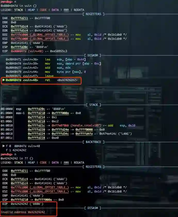 跟踪至vuln()返回,触发异常,EIP被劫持为“\x42\x42\x42\x42”。