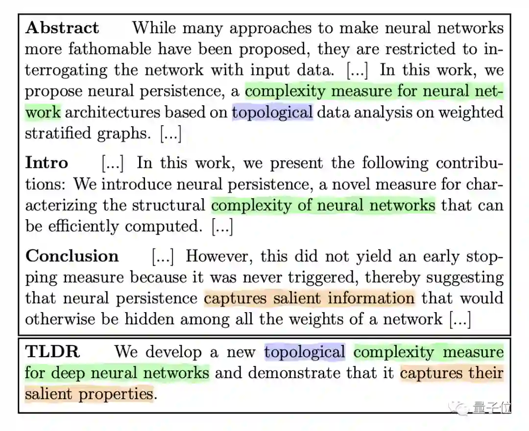 举个例子,下图中上边的格子中是摘要,简介,结论中相对重要的段落和句子。TLDR会标记出突出的部分,然后组合成一个新的句子。