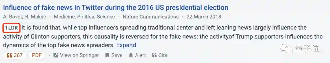 比如,在一款免费学术搜索引擎Semantic Scholar里,也加入了一个类似的高度概括AI:TLDR。