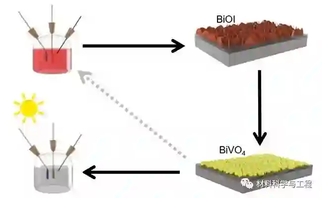 另外,为了减少暴露的基底表面带来的载流子的复合位点,通过“沉积-退火循环”法(图3)提高BiVO4在基底的覆盖度。所获得具有最优孪晶结构和覆盖度的BiVO4光阳极在0.6和1.23 VRHE下的电流密度分别为~2.1和~3.1 mA/cm2,在0.6 VRHE下可以得到1.35%的转换效率。该BiVO4孪晶的制备方法,为其它具有孪晶结构的半导体的制备提供了参考和借鉴。