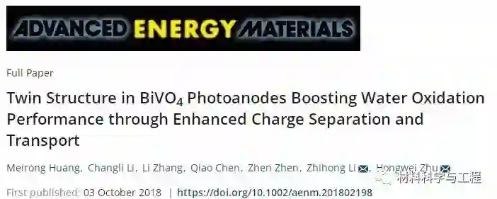 日前,清华大学材料学院朱宏伟教授课题组合作在《先进能源材料》(Advanced Energy Materials,IF=21.875)上发表了题为《孪晶结构BiVO4光阳极促进载流子的分离和传输提高产氧性能》的研究论文。该论文提出了制备具有孪晶结构的BiVO4光阳极的方法,验证了孪晶结构形成的同质结有利于促进载流子的分离和传输从而提高BiVO4的产氧性能。