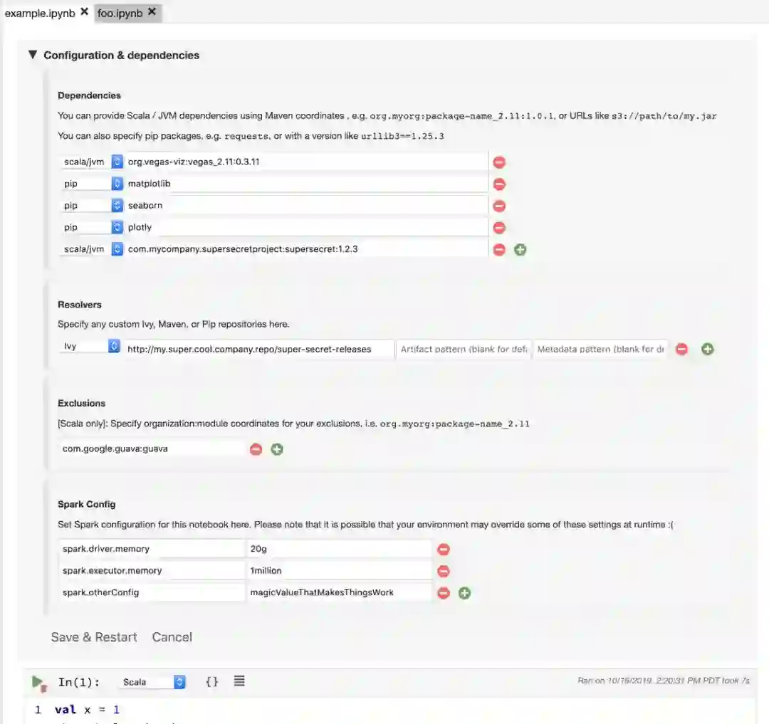 如上图所示,polynote 的配置和依赖管理界面类似于 PyCharm 等高级 IDE,可以自行改变各种依赖的版本和安装方法。和 Jupyter Notebook 不同,这些配置是不需要外部文件或集群服务器进行的。