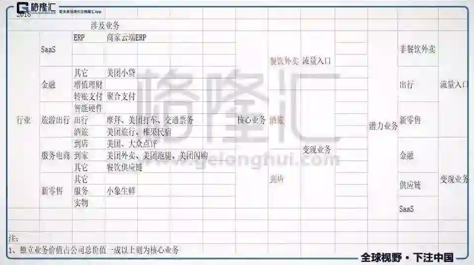 把美团的业务分为核心业务与非核心业务:核心业务指的是该业务价值占公司总价值的一成以上,非核心业务指的是该业务价值占总价值不到一成的业务;核心业务分为流量业务、变现业务。如下表: