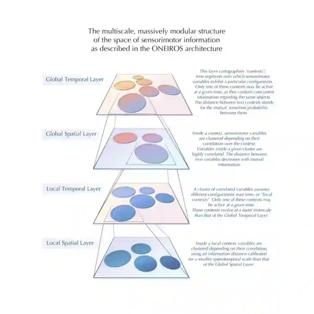 ONEIROS是从一个经典的RL思想开始的,集中于1)学习时空特征的模块化层次“maps”(使用PMI矩阵分解而不是梯度下降),2)通过注意力机制的形式进行上下文切换,以及3)内在动机(好奇心)。