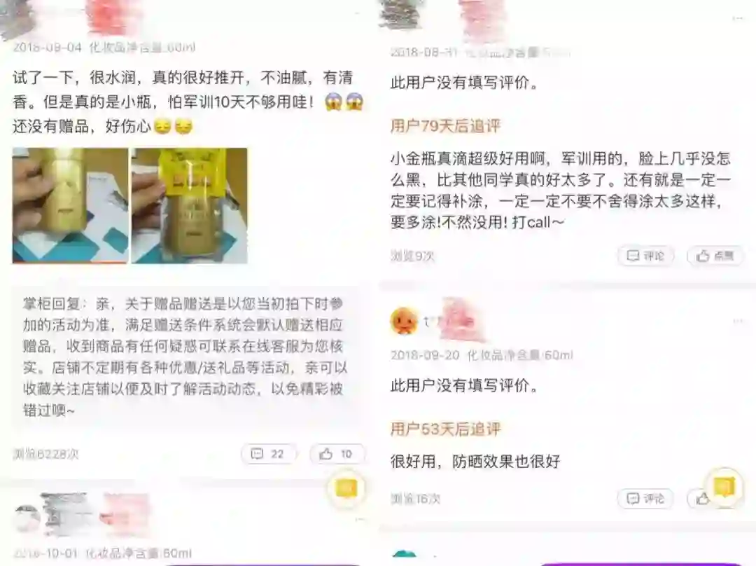 比如,卖防晒霜的好评说收到大瓶便宜,用了好抹开,就是不说自己哪怕在海滩暴晒24小时都没黑一点,卖防脱洗发液的说用完以后洗完顺滑光亮就是不说自己用了2周掉发情况有改善。