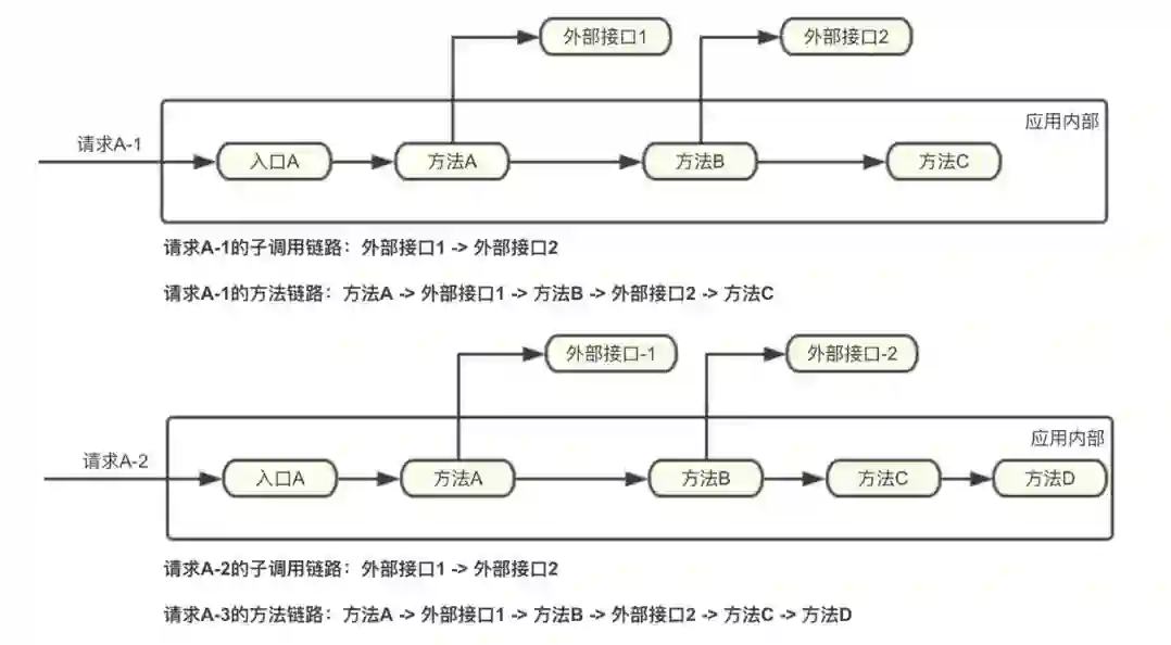通过在中间件代码中插桩,统一实现对外部子调用的代码路径采集,从而聚合出代码走过 的子调用链路,然后通过聚合链路请求得出每条子调用链路的热度,从而获得线上真实用户场 景的链路分布情况。子调用链路精准反馈了业务场景的链路和热度,这种基于线上真实请求得